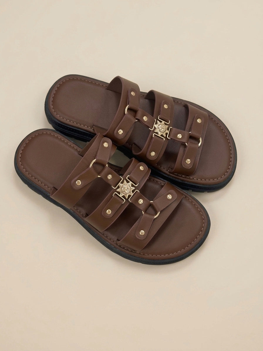 L’élégance estivale se dessine avec ces sandales plates aux lignes épurées, sublimées par de délicats détails dorés. Ce contraste de matières apporte une touche de lumière précieuse à vos pieds, transformant un basique de vacances en un véritable accessoire de mode. Une paire légère et raffinée, conçue pour accompagner vos robes fluides ou vos shorts en jean avec une sophistication naturelle.